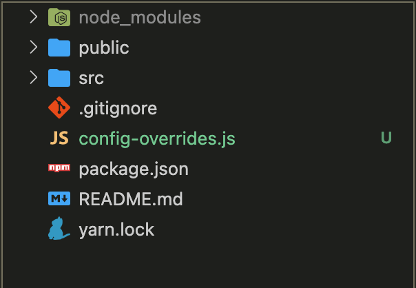 まずはプロジェクトルートに config-overrides.js を新規作成しよう。とりあえず何も記述していない状態で構わない。