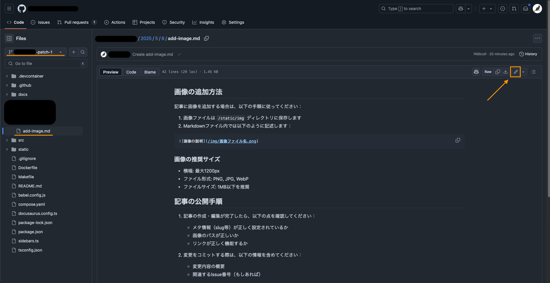 該当のファイルから編集を行います。ブランチとファイルが間違いないことを確認してください。