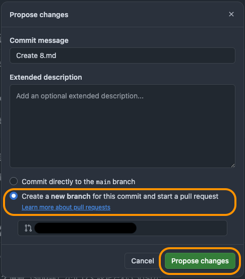 - ラジオボタンの「Create a new branch for this commit and start a pull request」を選択します(必須)
