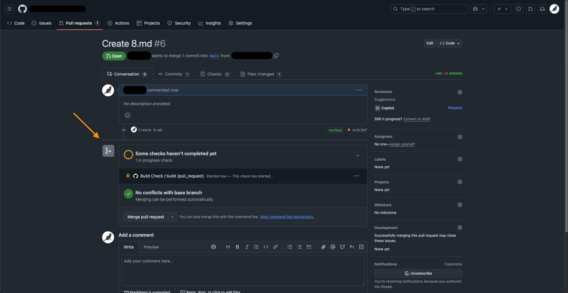 プルリクエストを再度確認します。ファイルが更新されたため、再度ビルド確認が行われています。ビルドが失敗した場合は、再度修正を行う必要があります。