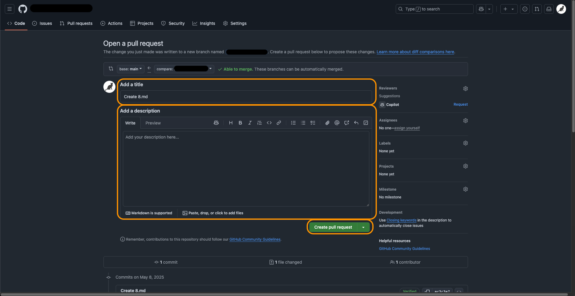 プルリクエストを作成します。これは本番環境のドキュメントに新たに記事を追加する申請のようなものです。他の人にレビューをしてもらう場合は、タイトルと説明を記載することをお勧めします。
