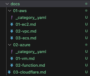 Markdownやフォルダの接頭辞には、数字とハイフンで順位付けすることをお勧めします(positionと呼ばれます)。フォルダで記事をまとめる場合には、category.yamlを作成してください。下記のようにラベルを設定することで、サイドバーにディレクトリ名ではなく、ラベルが適用されます。