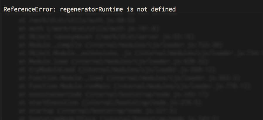 ES6で開発し、Babelでトランスパイルしたものをnode transpiled.jsの形で実行していますが、 「ReferenceError: regeneratorRuntime is not defined」のエラーが表示されるようになりました。。。